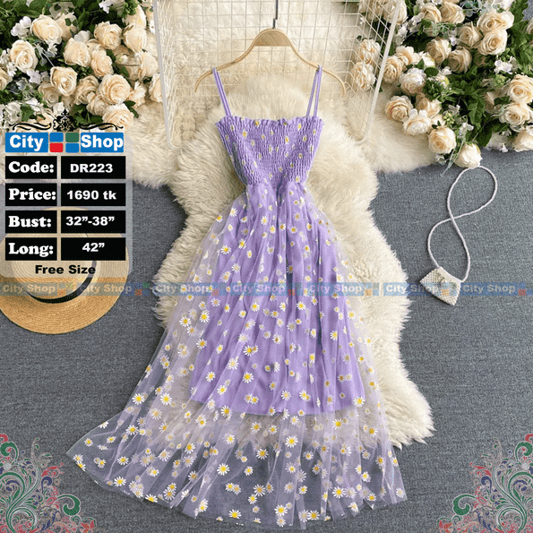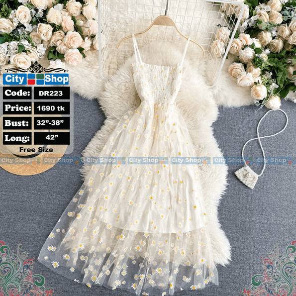 Fairy temperament gentle first love dress scheming off-shoulder mesh embroidery chrysanthemum splicing vacation travel shooting skirt