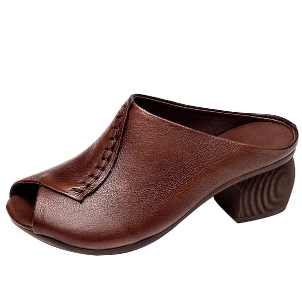 Original Gaodadong genuine fish mouth mid-heel slippers for outdoor wear soft leather soft sole fashionable thick heel half slippers for women