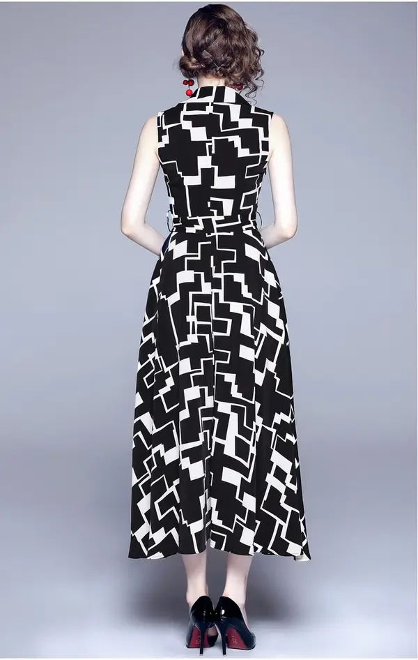 Niche design geometric print high-end dress v-neck sleeveless tie waist slim light mature style skirt trend