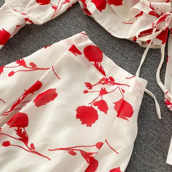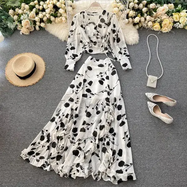 Autumn suit for women, holiday style, printed short chiffon shirt, ruffled hem, split skirt, printed short chiffon two-piece suit dress