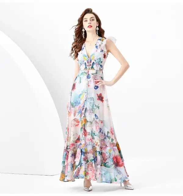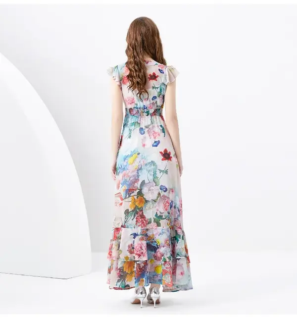 Gentle style, sweet flying sleeves, V-neck waishttps://cityshop4u.com/product/ruffled-print-dr, egant-long-skirt/t slim single-breasted A-line ruffled print dress, elegant long skirt