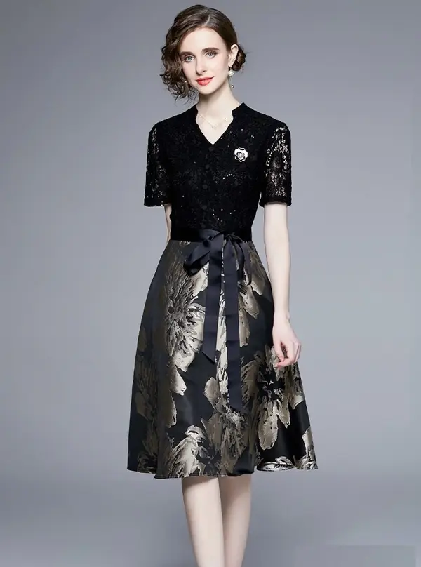 Summer French Hepburn style short-sleeved V-neck lace patchwork waist slimming medium-length A-line jacquard dress