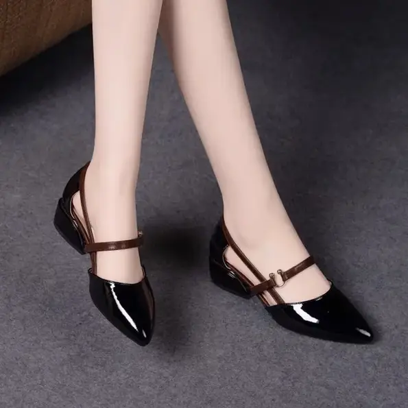 Women’s PU leather mid-heel patent leather shoes, pointed toe, hollow flat shoes