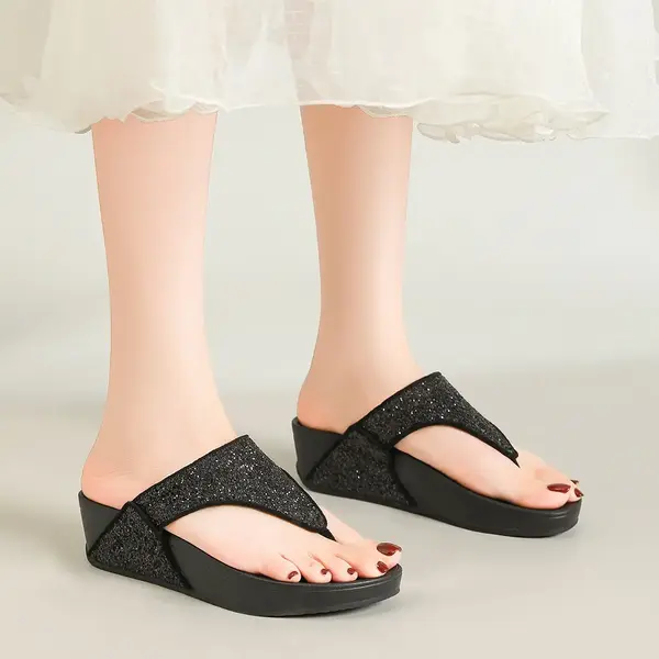 Rhinestone Flip-Flops for Women’s Summer Outer Wear New Anti-Slip Flip-Flops Wedge-Heeled Thick-Soled High-Heeled Beach Shoes